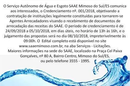 Através do Edital de Credenciamento nº 001/2018, processo 568/2018 o SAAE – Serviço Autônomo de Água de Esgoto de Mimoso do Sul informa que a partir de 24 de setembro de 2018 até 05 de outubro de 2018 , das 13h00 às 16h00 estará credenciando, sem qualquer exclusividade, empresas e instituições financeiras (BANCOS PÚBLICOS), ou outros que se enquadrarem nessa situação (casos que serão avaliados pela comissão do SAAE) que se habilitarem a prestar os serviços de recebimento de contas de água e esgoto e outros documentos de arrecadação emitidos pelo SAAE de Mimoso do Sul (ES), ao preço de R$ 0,75(setenta e cinco centavos) por guia de recolhimento recebida e autenticada.